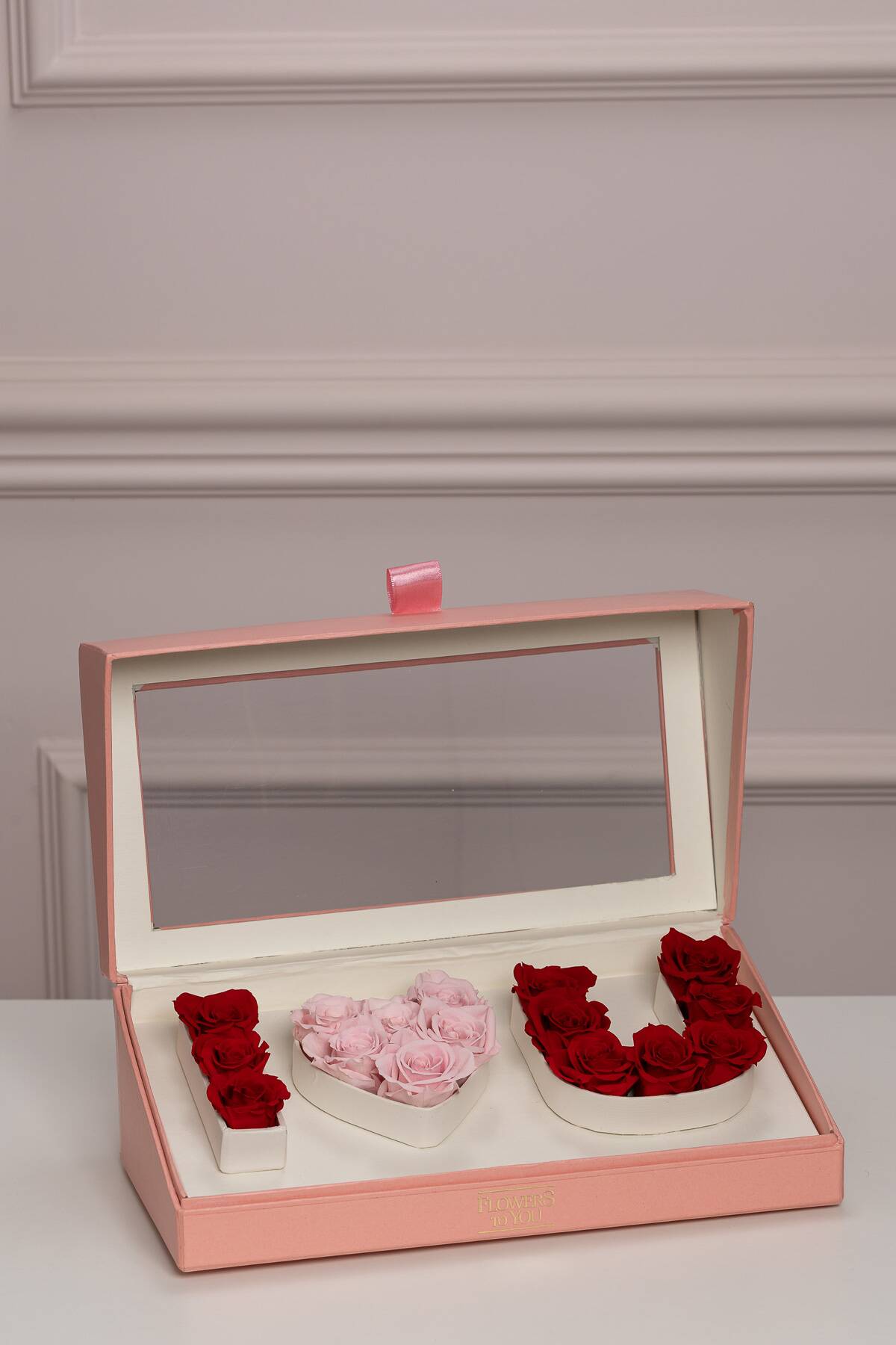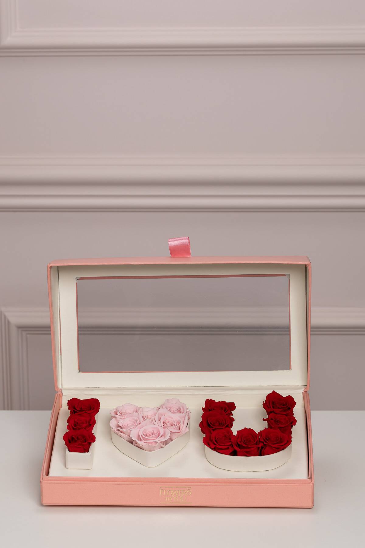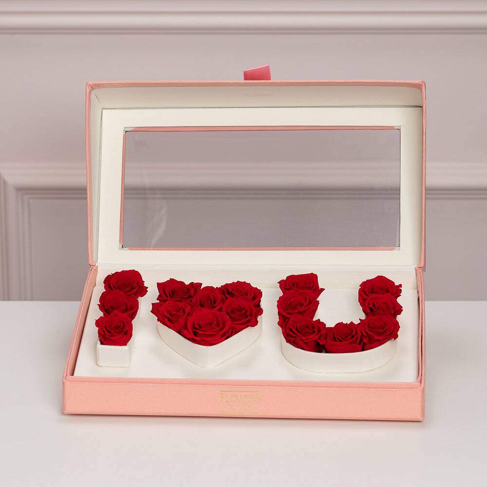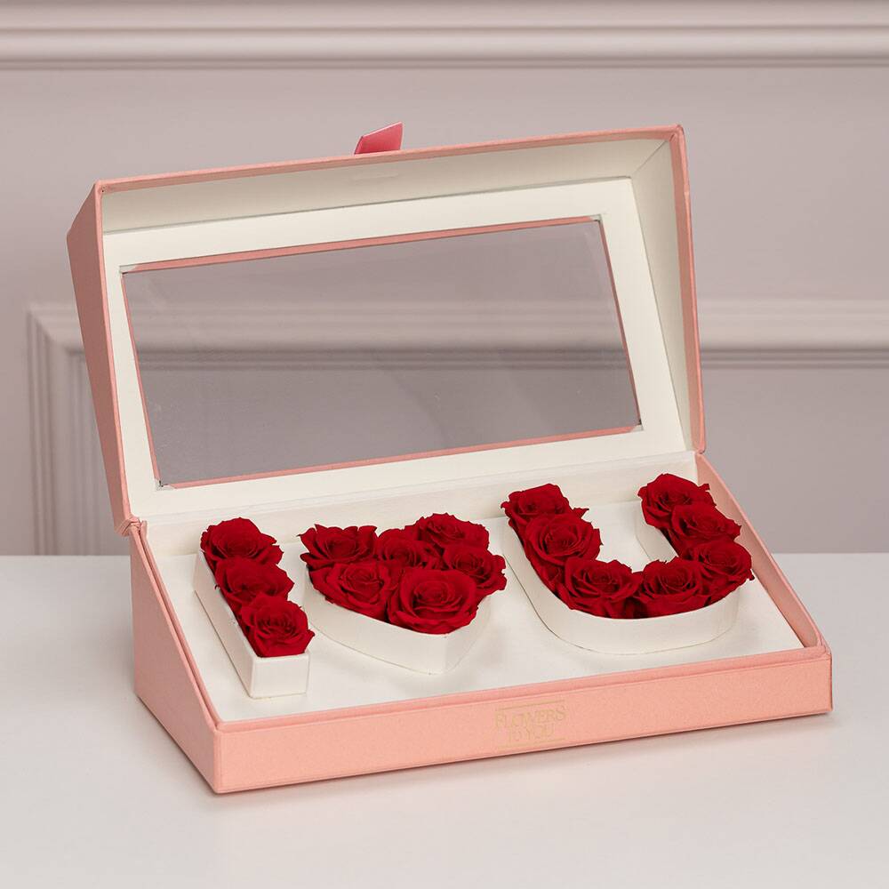 Um arranjo personalizado com a frase ” I LOVE U” composto por 16 Mini Rosas Preservadas Vermelhas.
