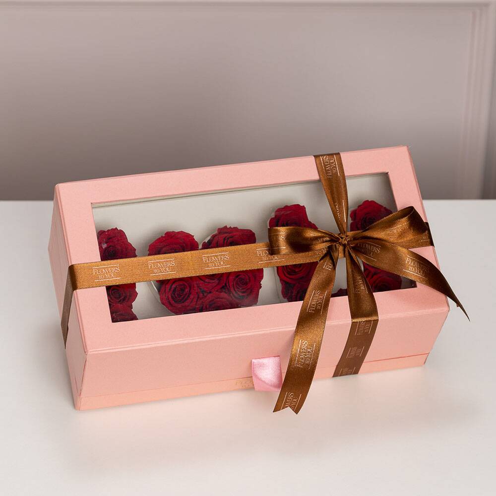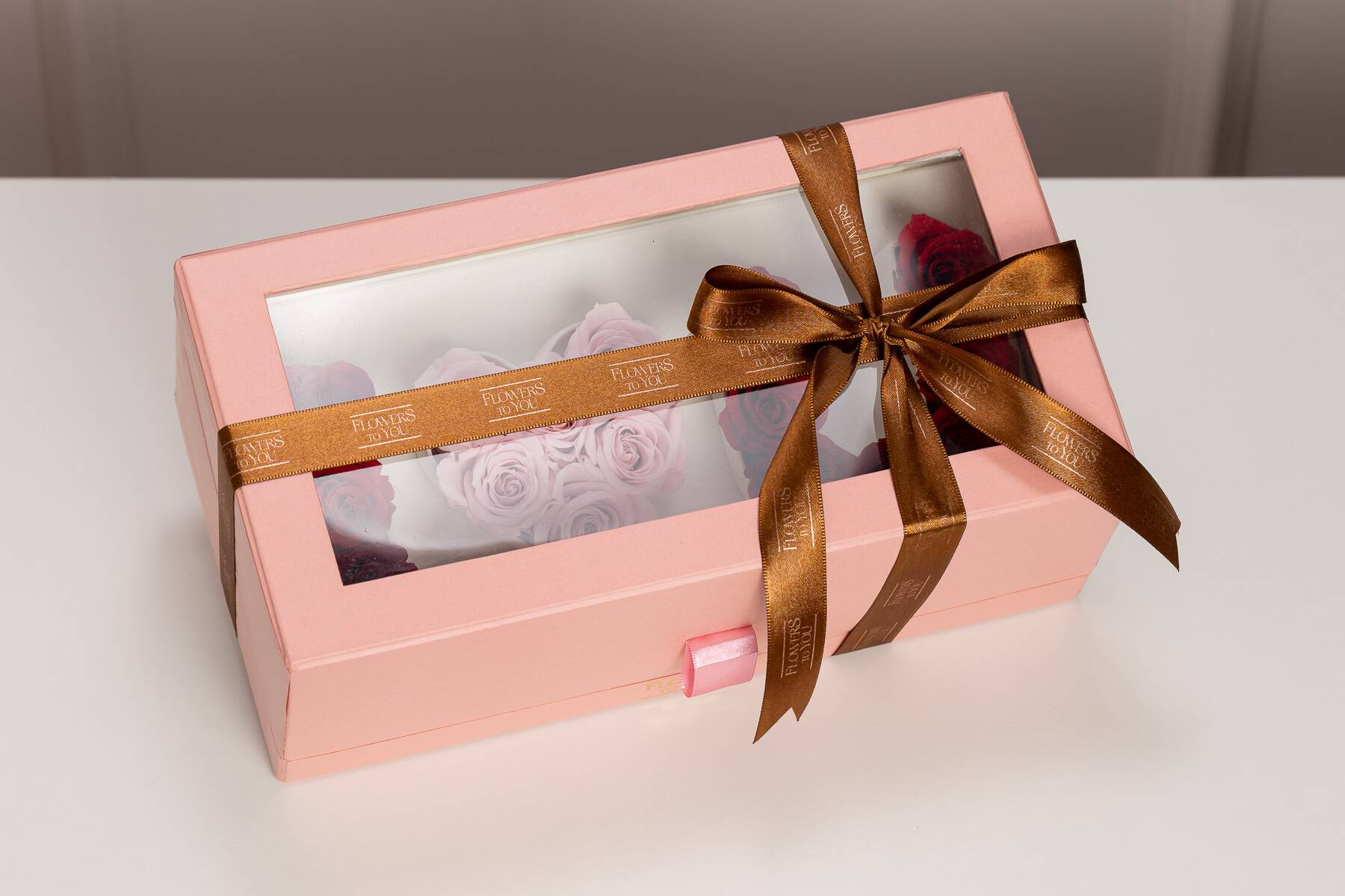 Esse produto acompanha sacola, envelope, cartão de mensagem e panfleto com informações sobre os cuidados com as rosas preservadas e como manter seu arranjo de flores bonito por muito mais tempo.